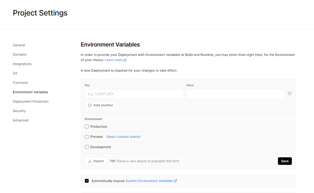 .env를 gitignore에 넣어놓았기 때문에 .env에 설정해준 키들을 vercel에 넣어줘야한다.