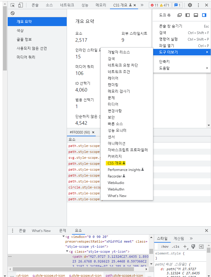개발자 도구 => 도구 더보기 => css 개요