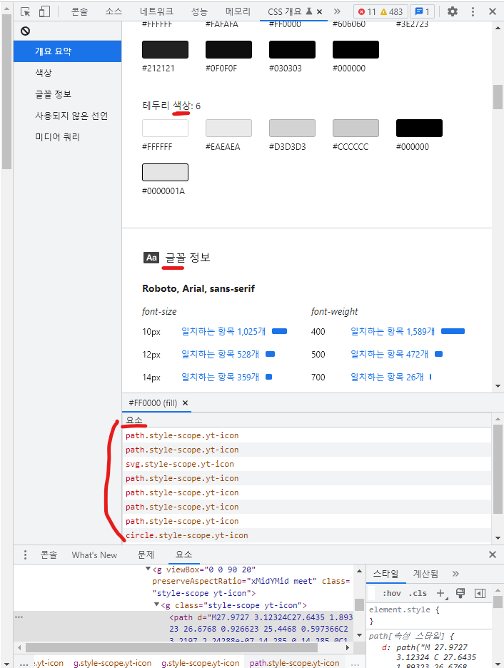 여기에 들어가면 폰트, 색상에 대한 정보들이 상세히 나와 있고, 정보를 클릭하면 어떤 요소에서 쓰이고 있는지도 보여준다.