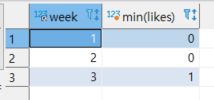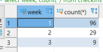 select week, min(likes) from checkins