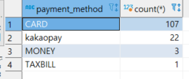 3. select:위에 조건에 맞는 payment method와 count(*) 가져온다.