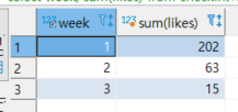 select week, sum(likes) from checkins