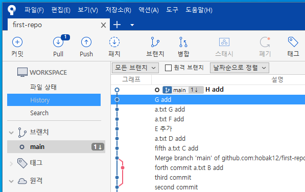 pull 버튼을 누르면 바로 로컬과 원격의 상태가 같아진다