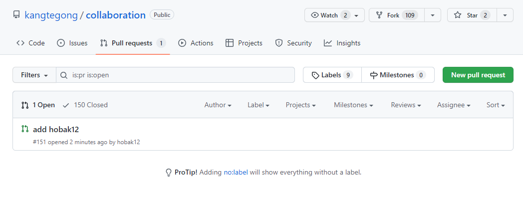 강사님 원본 저장소에 가면 pull request가 하나 들어가있는 것을 볼 수있다.