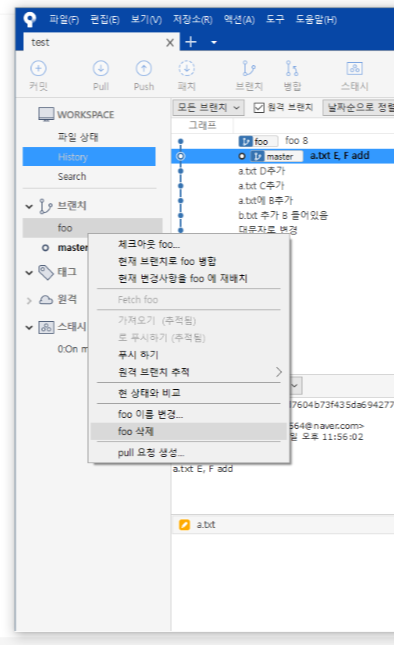 삭제하려는 브랜치 마우스 우클릭 삭제클릭