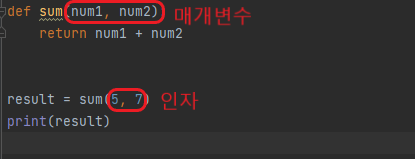 매개변수 parameter: 함수가 정의될 때 사용되는 변수