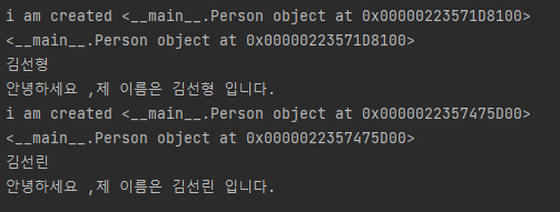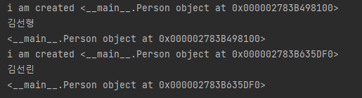 print( person1) 객체에 주소를 붙여서 분류해놓은 것이 나온다.