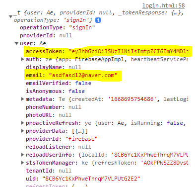 콘솔창에 이렇게 뜬다. user 내용을 보면 사용자 고유의 토큰이 생겼고, 이메일도 들어가있다.