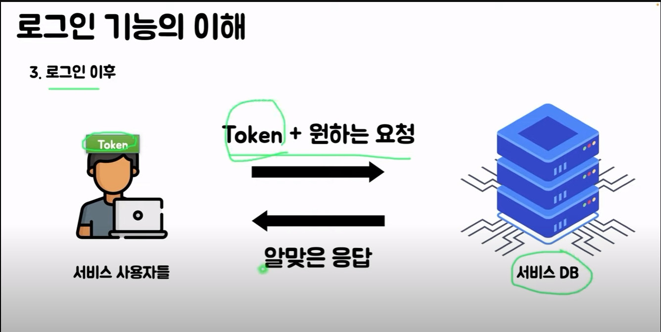 로그인 할 때 email과 pass워드를 넣었다면 서비스 DB는 토큰을 주면서 앞으로 이메일이랑 패스워드 말고 토큰만 주시면 요청을 받아들일게요 한다.